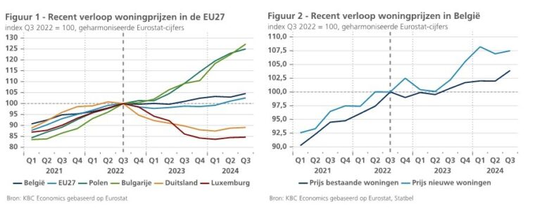 De hierboven besproken cijfers betreffen het verloop van de geharmoniseerde woningprijsindex die Eurostat op kwartaalbasis publiceert. Voor België wordt de reeks door het statistiekbureau Statbel becijferd, die ze vervolgens aan Eurostat aanlevert. De index is gebaseerd op een methodologie die opgesteld is op Europees niveau om de vergelijkbaarheid tussen de EU-landen te garanderen. Naast de internationale vergelijkbaarheid heeft deze index ook het voordeel dat hij corrigeert voor prijswijzigingen die het gevolg zijn van veranderingen in de karakteristieken van de verkochte woningen (bouwjaar, nuttige oppervlakte, aantal kamers, e.d.). Daardoor geeft de geharmoniseerde index een goed beeld van de werkelijke onderliggende prijsdynamiek op de woningmarkt, los van wijzigende woningkenmerken. KBC Economics gebruikt deze index daarom als referentie voor haar woningprijsanalyses en -projecties.