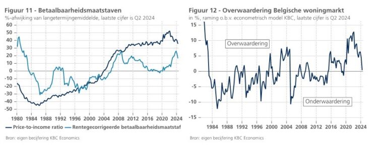 De afkoeling heeft ertoe geleid dat de overwaardering van de Belgische woningmarkt, althans volgens het vraaggedreven KBC-model, is weggewerkt. Volgens dit model dient de overwaardering dus niet langer gezien te worden als een voornaam risico voor prijscorrecties. Rekening houdend met de verwachte ontwikkeling van de marktfundamentals gaan wij ervan uit dat de woningprijzen in 2025 en 2026 telkens gematigd, met zo’n 3% per jaar, zullen stijgen. Dit scenario blijft omgeven met onzekerheid. De belangrijkste betreft de mate waarin het aanbod van extra woningen aan de woningbehoefte zal tegemoetkomen. Het valt in dat verband op dat het aantal wooneenheden sinds 2023 niet langer sterker toeneemt dan het aantal huishoudens. Een te star aanbod kan ervoor zorgen dat de prijsdruk uiteindelijk groter zal uitvallen dan de verwachte 3%.