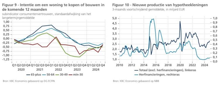 Dat de situatie op de Belgische woningmarkt de voorbije maanden enigszins verbetert, blijkt ook uit indicatoren met betrekking tot de vraag naar woningen. Zo is de vertrouwensindicator van de Europese Commissie die peilt naar de intentie van Belgen om een woning te kopen of bouwen recent licht opgeveerd (figuur 9). Dat geldt overigens voor alle leeftijden, wat erop wijst dat niet alleen de woningvraag vanwege jonge gezinnen (‘first-time buyers’) maar ook die vanwege investeerders en oudere ‘verhuizers’ in positieve zin aan het keren is. De verbetering van de woningvraag komt ook naar voren in cijfers inzake de productie van nieuwe hypotheekleningen (figuur 10). Die waren sinds juni 2022 fors teruggevallen maar nemen sinds het voorjaar van 2024 weer toe, al blijft het niveau ervan nog altijd ruimschoots onder de eerdere piek.