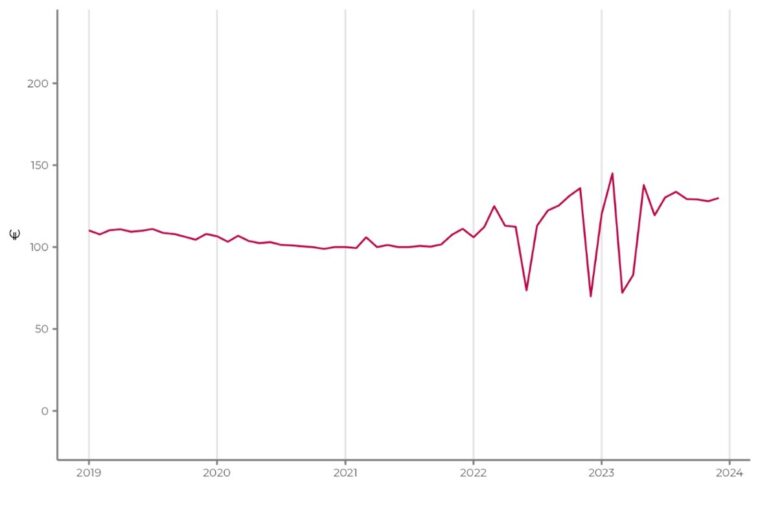 Figuur 3: Evolutie van de mediaan maandelijkse energiefactuur van de gezinnen (in euro)