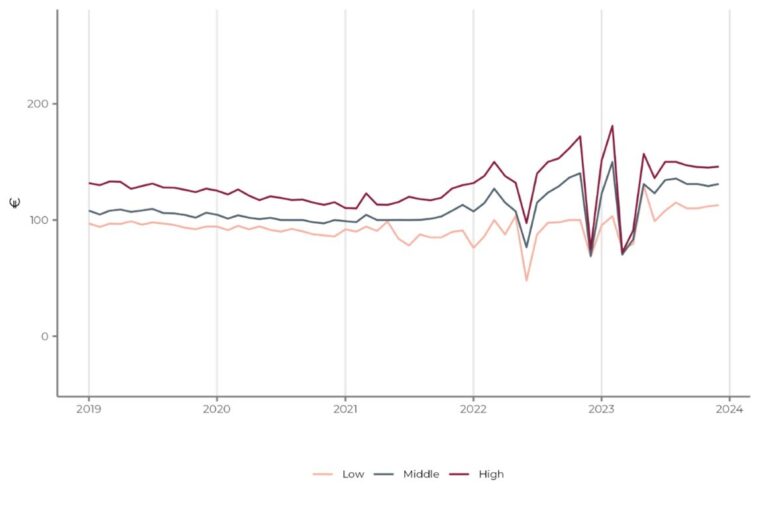 In 2022 is de mediaan factuur voor de lage inkomensgezinnen met 9,3% gedaald, terwijl ze bij de midden- en hoge inkomensgezinnen respectievelijk 6,7% en 14,9% duurder wordt (Figuur 4).