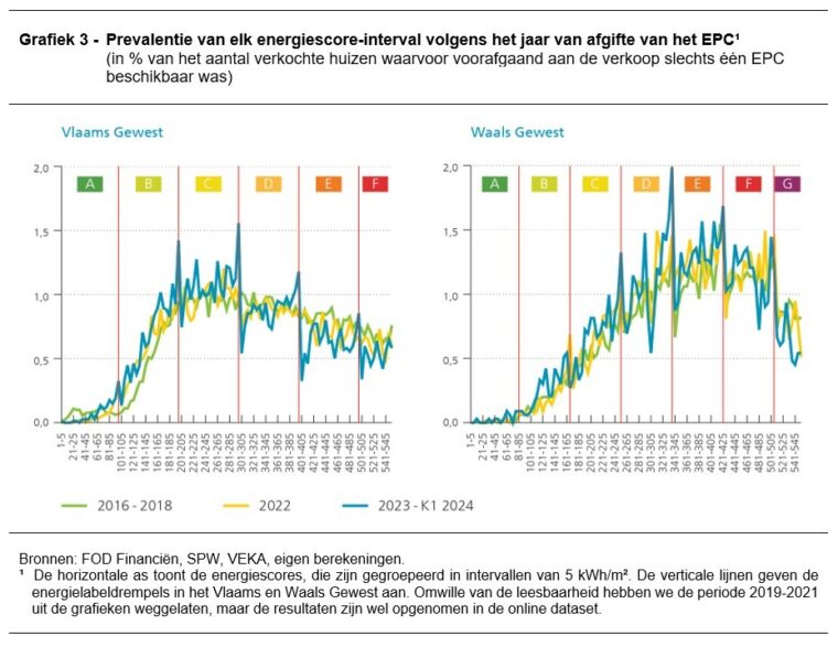 Ten vierde zien we sinds 2023 een toegenomen concentratie van energiescores net onder de drempelwaarden van de energielabels in het Waals en vooral het Vlaams Gewest. Grafiek 3 toont het aandeel van elk EPC-score-interval met een breedte van 5 kWh/m² als percentage van het totale aantal EPC's voor verkochte huizen in het Vlaamse en Waalse Gewest. We meten de concentratie door de prevalentie van het energiescore-interval net onder de energielabeldrempel te vergelijken met die er net boven, die ongeveer gelijk zou moeten zijn als er geen concentratie is. Er moet echter worden opgemerkt dat de daling in de prevalentie van energiescores net boven de drempelwaarde van het energielabel deels ook het gevolg kan zijn van het feit dat huizen niet te koop worden aangeboden of niet worden verkocht nadat ze een energiescore aan de verkeerde kant van de drempelwaarde hebben gekregen. Ten eerste, aangezien het Vlaamse energielabel pas in 2019 werd ingevoerd, kon er geen sprake zijn van concentratie in de periode 2016-2018. De invoering van het energielabel leidde tot een kleine concentratie in de periode 2019-2021 en in 2022, met 30 %-40 % meer verkochte huizen met energiescore-intervallen net onder de drempelwaarde dan net erboven. De concentratie nam sterk toe in de periode 2023-K1 2024, waarbij energiescore-intervallen net onder de drempel twee tot bijna vier keer vaker voorkwamen dan intervallen juist boven de drempel. Dit was het duidelijkst bij de renovatieverplichtingdrempel, tussen de labels D en E. Aangezien het energielabel eerder werd ingevoerd in het Waals Gewest, was er daar al sprake van concentratie in de periode 2016-2018 en deze bleef constant in 2019-2021 en 2022, waarbij de prevalentie van energiescore-intervallen net onder de drempelwaarden ongeveer 50 % hoger lag. In 2023 nam de concentratie toe, maar in mindere mate dan in Vlaanderen.