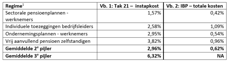 De impact van de schaalgrootte houdt uiteraard verband met de hierboven reeds geschetste verscheidenheid op vlak van de aanvullende pensioenpijlers, gaande van een individuele burger die een contract afsluit tot grote ondernemingen of sectoren die een pensioenplan opstarten voor een omvangrijke groep van werknemers. Een consistente vaststelling binnen het rapport is dat pensioenplannen voor grote groepen (inzonderheid sectorale pensioenplannen) lagere kosten optekenen. Ter illustratie van deze vaststelling geeft de tabel hieronder de gewogen gemiddelde instapkosten weer voor de verzekeringsproducten van het type tak 21 (% uitgedrukt ten opzichte van de bijdragen – voorbeeld 1) en voor de totale kosten van toepassingen bij de instellingen voor bedrijfspensioenvoorziening (IBP’s - % uitgedrukt ten opzichte van de voorzieningen – voorbeeld 2).