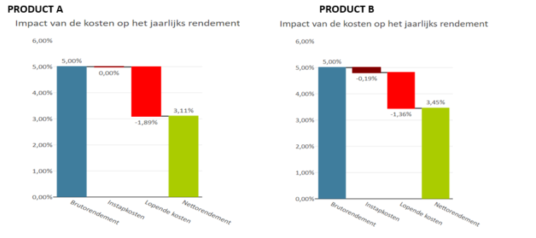De inning van kosten heeft vooreerst een impact op het effectief toegekende rendement (in de grafieken aangeduid als ‘Nettorendement’). Deze simulatie toont aan dat het rendement dat overblijft na toepassing van kosten iets lager uitvalt bij product A, ondanks het schrappen van de instapkosten.