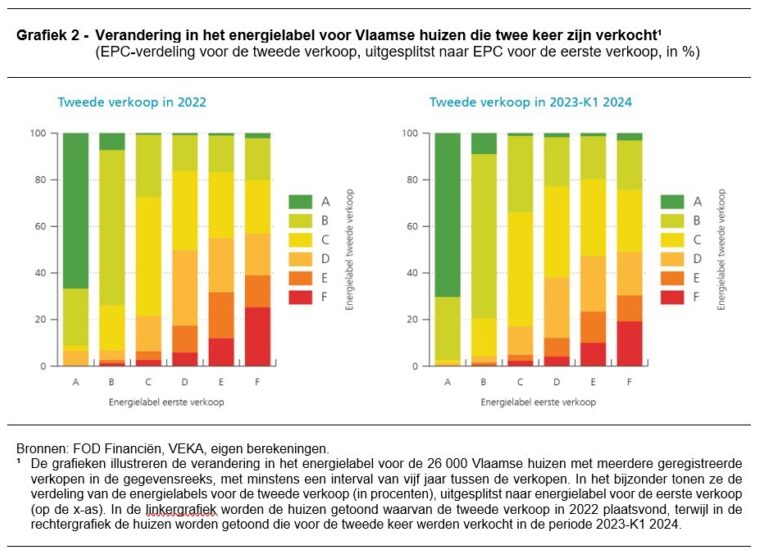 Ten tweede stellen we vast dat de invoering van de Vlaamse renovatieverplichting slechts een kleine negatieve invloed had op de prijzen van Vlaamse huizen met een energielabel E of F. Uit onze statistische analyse bleek dat energie-inefficiënte huizen in het Vlaams Gewest ongeveer 2 % goedkoper werden, zowel in vergelijking met soortgelijke huizen in het Waals Gewest als met huizen met energielabel D in het Vlaams Gewest. Deze invloed was niet onmiddellijk zichtbaar, maar nam veeleer geleidelijk toe in de loop van 2023 en bleef stabiel in de eerste drie kwartalen van 2024. Tot slot blijkt uit onze vergelijking met het Waals Gewest dat de Vlaamse energetische renovatieverplichting de prijzen van huizen met een betere energiescore niet heeft opgedreven, aangezien vergelijkbare prijsstijgingen werden opgetekend in beide gewesten.