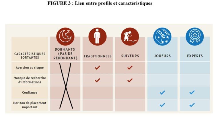 Le même phénomène est également observé pour les profils davantage actifs (joueurs et experts) mais dans ce cas, les deux caractéristiques qui apparaissent sont la confiance et l’horizon de placement élevé.