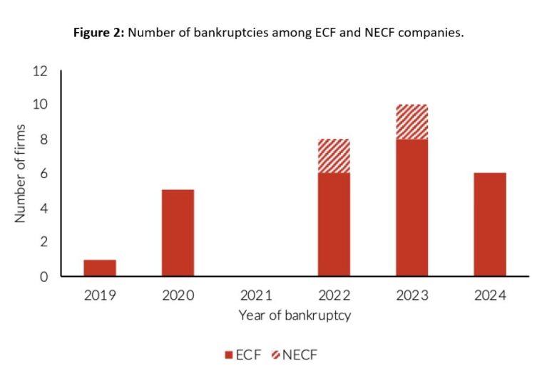 Arhinful (2023) emphasizes that increased financial leverage heightens the risk of failure, as firms may encounter difficulties in repaying loans. This risk is particularly pertinent for equity crowdfunding (ECF) firms, which were observed to have significantly higher debt levels relative to their size in the year preceding crowdfunding. Signori and Vismara (2018) reported a 17.9% failure rate among equity crowdfunded firms, closely aligning with the 17% failure rate identified by Walthoff-Borm et al. (2018). The descriptive analysis of survival chances supports existing literature and thereby confirms Hypothesis 2. Among the 208 companies analysed, 30 declared bankruptcy, with 26 being equity crowdfunded and only four not funded through equity crowdfunding, as illustrated in Figure 2. This analysis indicates that ECF companies are more likely to fail. Furthermore, although Spreds funded its first project in 2013, the first bankruptcy in the dataset did not occur until 2019, aligning with the observed trend that companies often fail approximately five years after receiving crowdfunding. Notably, the management and consultancy sectors appear to be particularly vulnerable.
