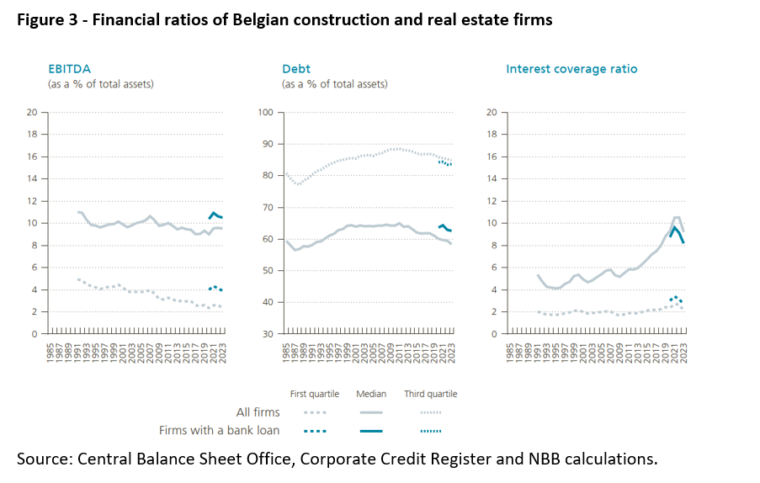 The distribution of profitability, indebtedness and interest coverage ratios across Belgian firms active in the construction and real estate sector illustrates this heterogeneity. It shows a pronounced difference between the median and worst quartile observations across the population of real estate firms. This also confirms that the sector has a significant sub-segment of weaker firms which are vulnerable to adverse shocks.