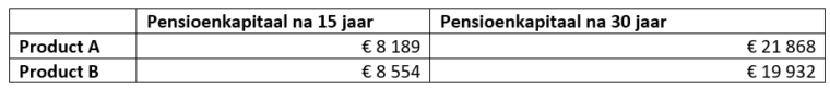 Bij de kortere looptijd van 15 jaar zullen de hogere instapkosten van product A zwaarder doorwegen op het resultaat. Over een langere periode, in dit geval na 30 jaar, zullen de hogere lopende kosten van product B echter een grotere impact hebben op het pensioenkapitaal.