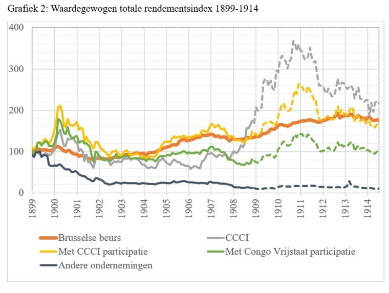 Om met deze factoren rekening te houden construeer ik rendementsindices die pas starten in 1899 toen er een aanzienlijk aantal CVS-ondernemingen naar de beurs ging. Hierbij maak ik ook een onderscheid tussen (a) de CCCI, (b) ondernemingen waarin de CCCI een participatie had, (c) ondernemingen met een participatie van de CVS, en (d) de andere CVS-ondernemingen. Uit grafiek 2 blijkt dat van 1899 tot de overdracht van Congo aan België in 1908 enkel de CCCI en ondernemingen met een CCCI-participatie gelijke tred konden houden met de Brusselse beurs. De performantie van onafhankelijke ondernemingen in de CVS was desastreus. Zelfs ondernemingen met de CVS als aandeelhouder presteerden vanaf 1903 aanzienlijk slechter dan de Brusselse beurs.